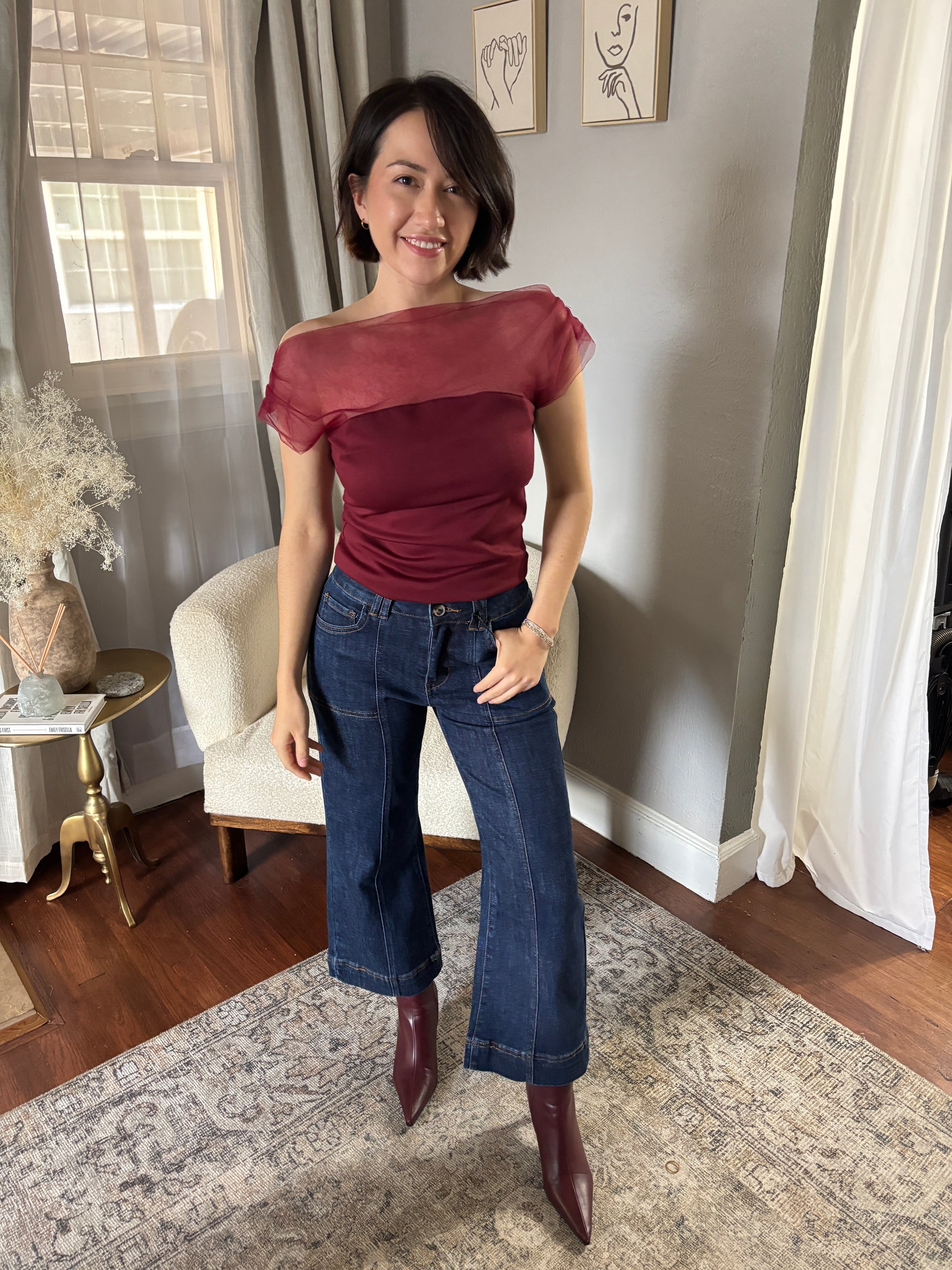 The Amarah Top is your new go-to for effortless style! This playful piece blends mesh and ponti fabrics for a dynamic mix that keeps things interesting. The draping creates a flattering silhouette that moves with you, whether you're heading to brunch or a night out. Lightweight and versatile.