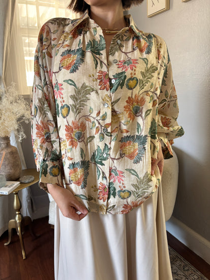 A soft, flowy button-down with an easy batwing sleeve and the prettiest autumn floral print. Lightweight with an effortless drape, it feels vintage without trying. Wear it tucked, loose, or half-buttoned for that relaxed, cool-girl look that still feels polished.
