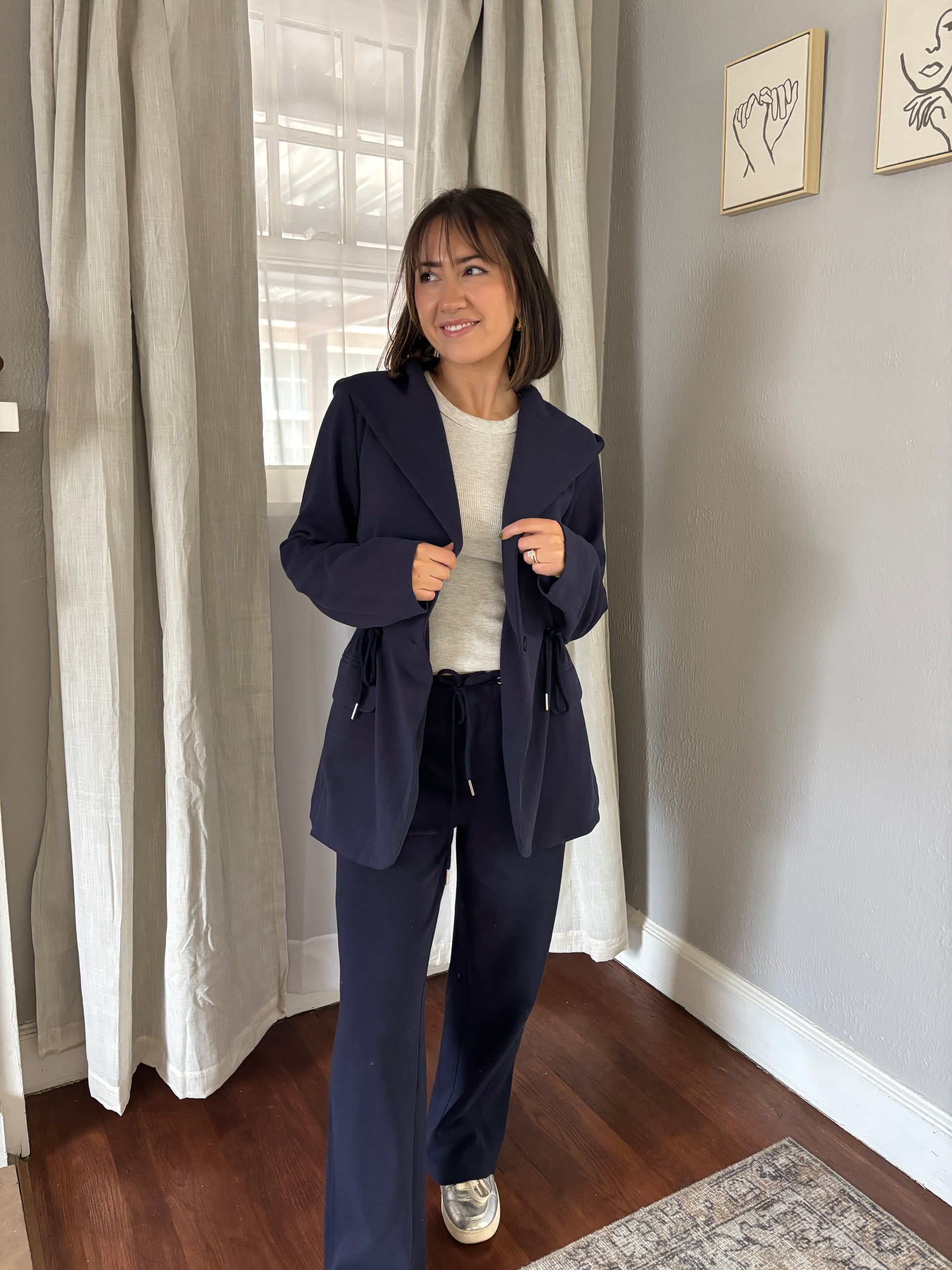 This Catching Flights Jacket takes knitwear to new heights with its playful mix of cozy comfort and chic style. The sleek silhouette and hip-skimming length offer a flattering fit, while the adjustable drawstring waist lets you customize your look. Handy front pockets and stylish seam details add a touch of sophistication, making it perfect for anything from casual hangouts to spontaneous adventures. Crafted from a soft blend of polyester, cotton, and spandex, this jacket brings a fun twist to your everyday wardrobe