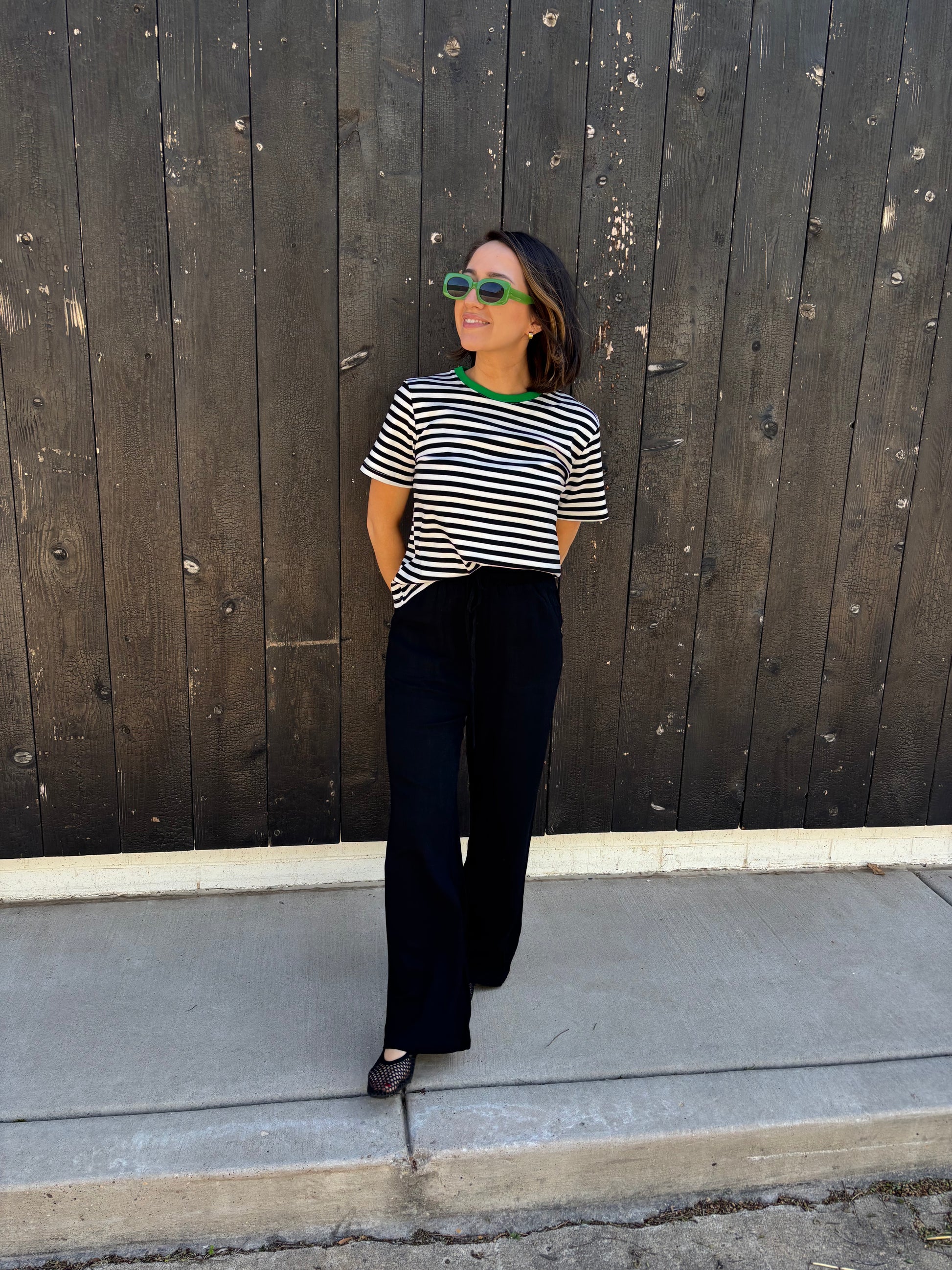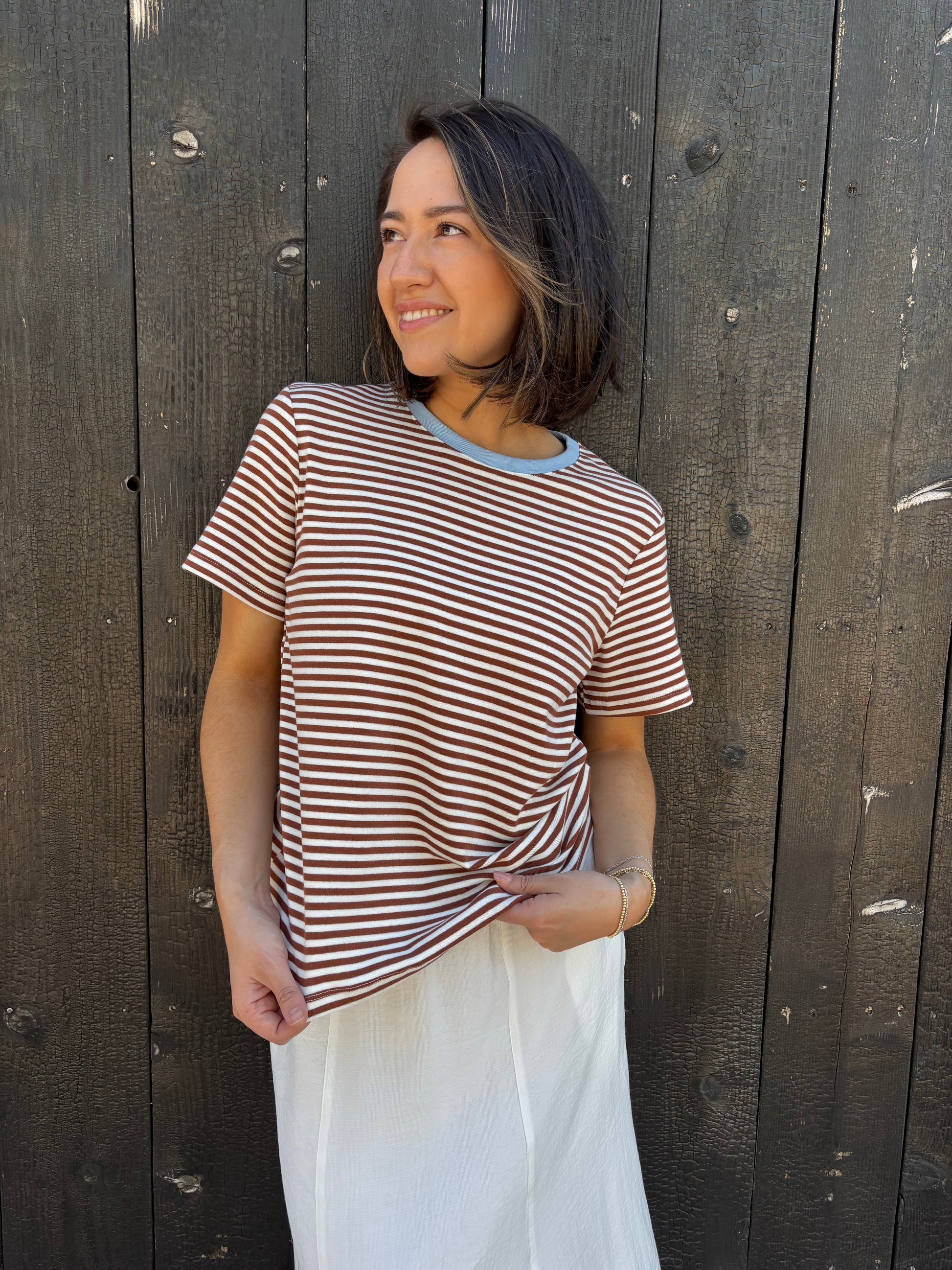 The Collar Me Cute Tee is a playful take on the classic striped tee. Its neck band, in a contrasting color, adds a touch of quirk to the crew neck design. Made of a comfortable cotton-spandex blend, this tee is perfect for any casual occasion.
