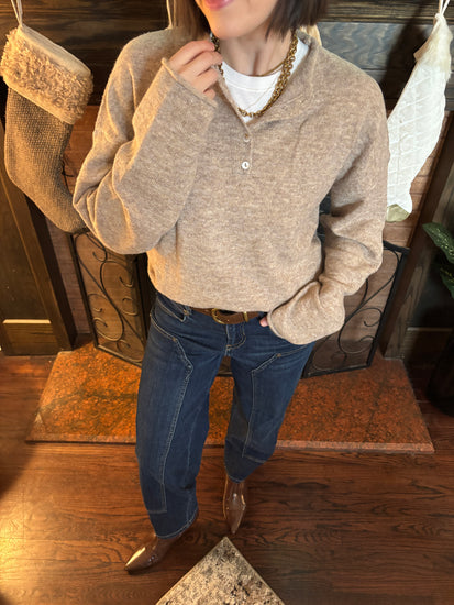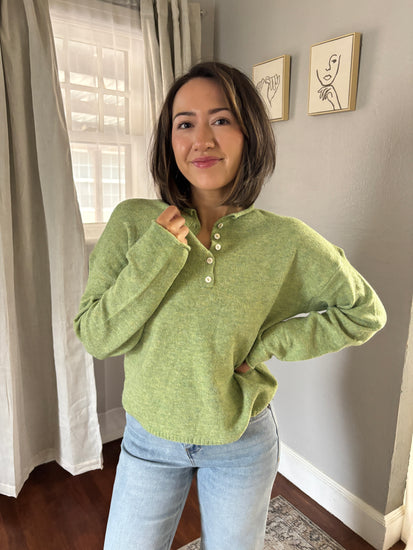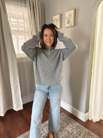 A soft knit with a classic button-up henley neckline. Easy to half-tuck, layer, or wear loose — she’s that effortless, just-threw-it-on piece that always works.