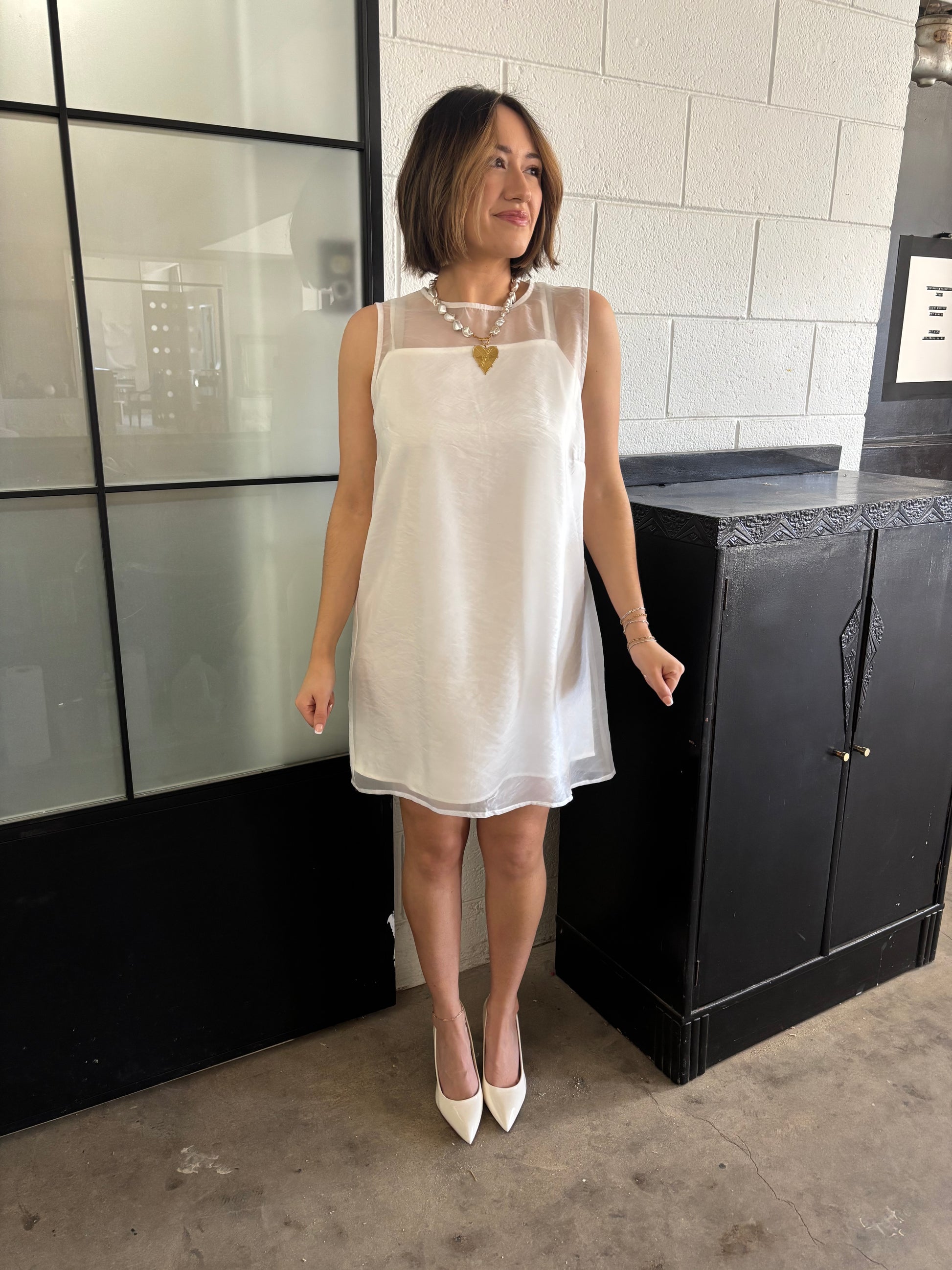 Delicate organza mini dress with a flattering back keyhole and button closure. Lined cami-style for comfort and coverage, featuring adjustable straps for a customized fit. The perfect piece for elevated occasions or layered styling.