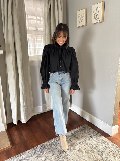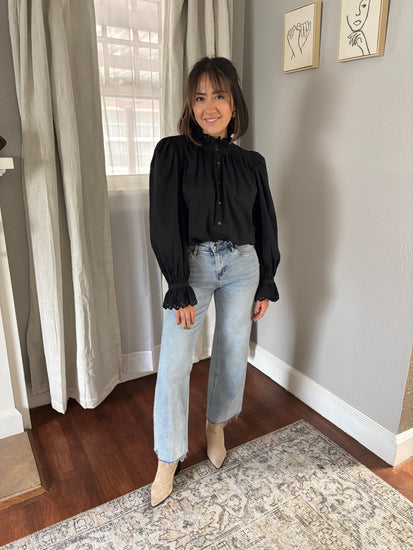 The Marie Top brings a playful twist to your wardrobe with its charming button-up front and airy balloon sleeves edged in delicate lace trim. Perfect for adding a flirty touch to any outfit, this blouse combines comfort and style effortlessly.
