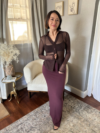 Elevate your wardrobe with this flirty mesh button-up that's equal parts chic and fun. Sheer fabric showcases delicate dot details throughout, while long sleeves keep things sophisticated. Perfect for layering over a slip or styling solo for that effortlessly cool vibe. Whether you're heading out for a night on the town or dressing up a casual look, this playful piece delivers major style points with minimal effort.