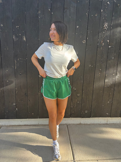 Introducing your new go-to active shorts: Run It Back. These breathable, relaxed shorts let you move with ease. These shorts feature a smocked waistband, contrast seams, and trendy pleated sides.