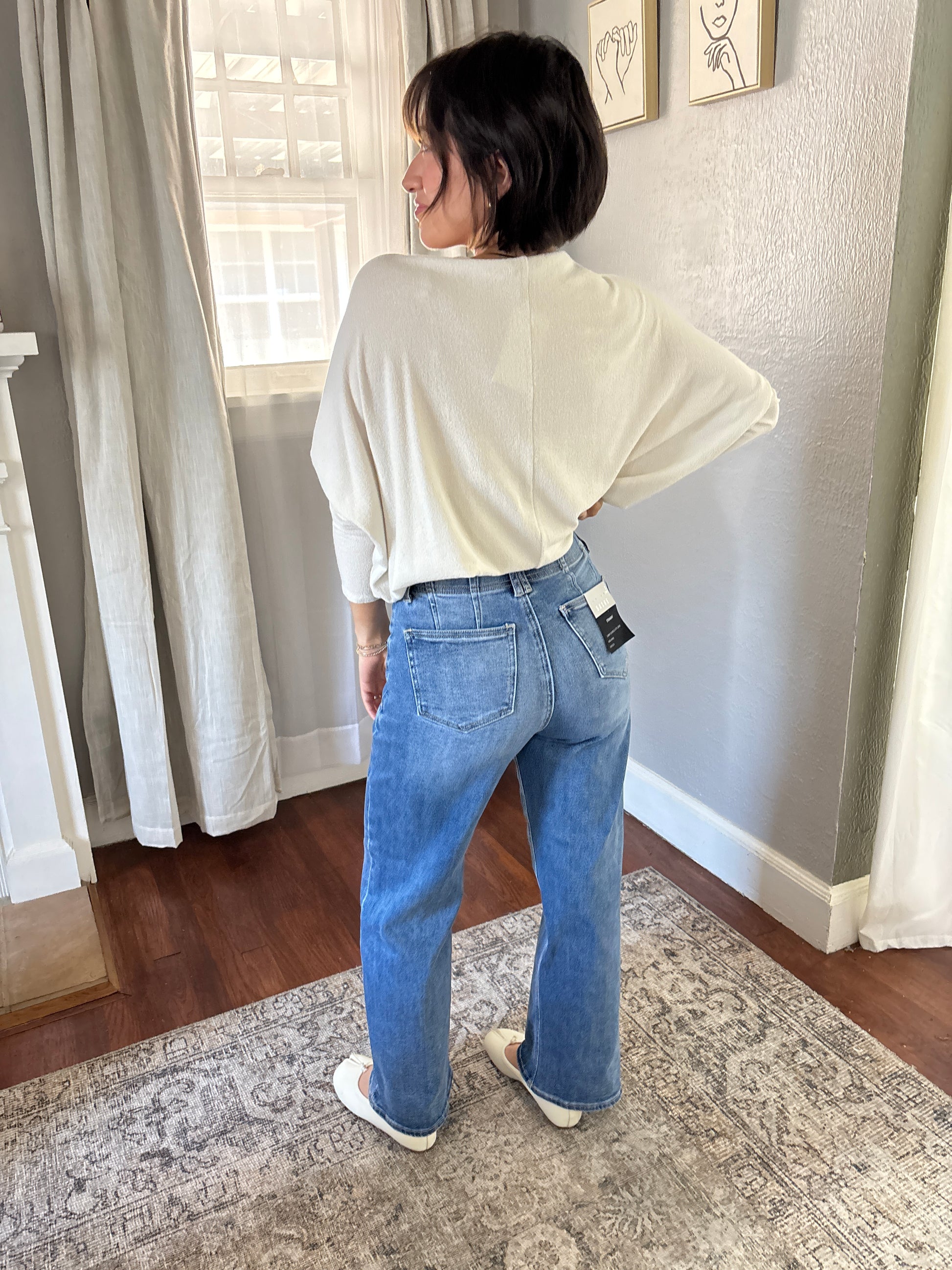 These Staple Straight Jeans bring the perfect mix of comfort and style with their stretchy fabric and flattering high rise. Featuring a zipper fly and double buttons, they stay secure while you move. Classic 5-pocket styling keeps it cool and practical. With a 10 ½ inch rise, 28-inch inseam, and roomy 19 ½ inch leg opening, these jeans fit just right for all-day fun and flair. Made from a cozy blend of cotton, polyester, and spandex