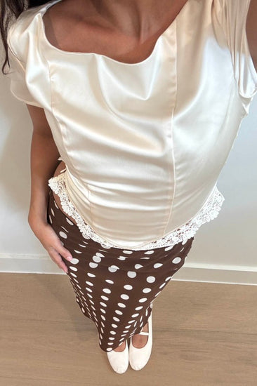 This top features delicate lace trim that adds a touch of femininity, while the fitted corset design accentuates your silhouette beautifully. The pointy hemline offers a modern twist. With a convenient center back hook and eye closure and a self-tie detail at the center back neck, this top ensures a secure and customizable fit.