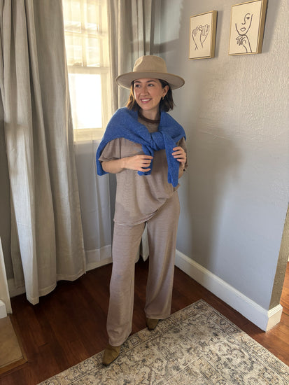 The fabric blend gives you the best of both worlds. Soft and breathable against the skin with a subtle weight that holds its shape. The touch of wool and acrylic adds warmth and texture, while cotton and spandex keep it flexible and wearable all day. It’s the kind of set you throw on for coffee, errands, travel days, or casual plans and somehow still feel put together.