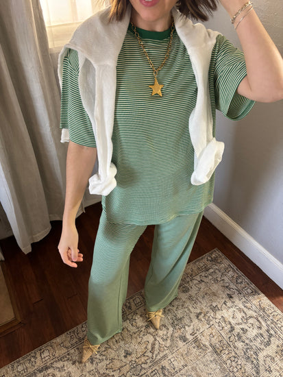 An elevated take on everyday comfort, this striped knit set is relaxed without looking sloppy and polished without trying too hard. The top has an easy drape with just enough structure, while the matching pants flow straight through the leg for that long, effortless line. Together, they read intentional, styled, and cool but they’re just as comfortable as your favorite lounge pieces.
