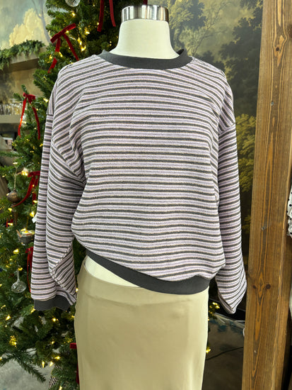 Made from a textured cotton rib knit with a little spandex stretch, this lavender stripe moment is your new “effortless but I still tried” piece. Finished with contrast rib hem + cuffs for that elevated casual vibe.