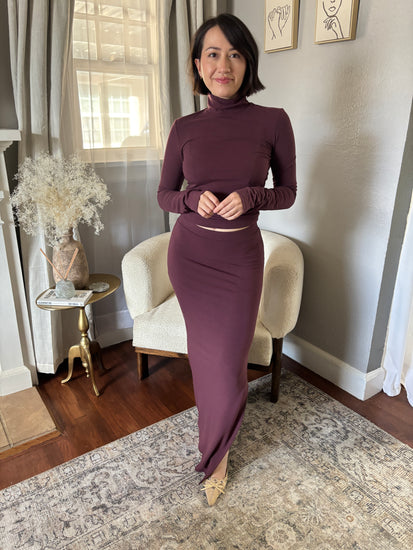 Introducing the Winter Muse Set your new go-to for effortless elegance. This dynamic duo pairs a luxuriously soft turtleneck with a sleek maxi skirt, both crafted from a sumptuous knit blend that moves with you. The fitted top features long sleeves and a chic foldover neckline, while the hip-hugging skirt showcases a daring side slit and flows gracefully to your ankles. Wear them as a coordinated set for instant sophistication, or separate them to remix with your favorite basics. Versatile, comfortable, and undeniably chic.